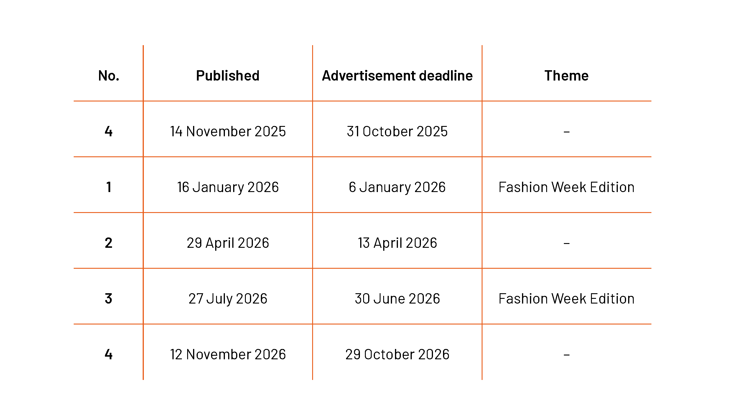Both Fashion Week editions are published in a larger print run (approximately 5,000 copies).
