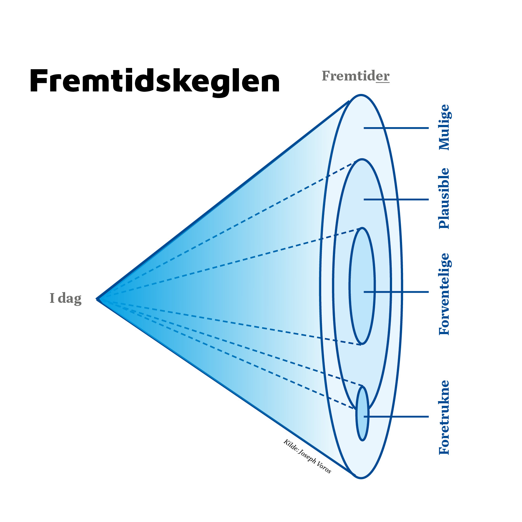 Længere ude, i fremtiden, bliver rummet bredere, og det giver mindre mening at sætte sin lid til én kurve. Her arbejder vi på tværs af forventelige, plausible, mulige og ønskværdige fremtider, som vi kan forestille os, og så bruger vi dem som pejlemærker. Til hjælp kan man benytte et værktøj som fremtidskeglen, som Joseph Voros har gjort til et kendt redskab. Pointen er ikke at overkomplicere tingene, men i højere grad at undgå at blive fastlåste eller ensporede i vores forventninger om, hvad der kan ske.