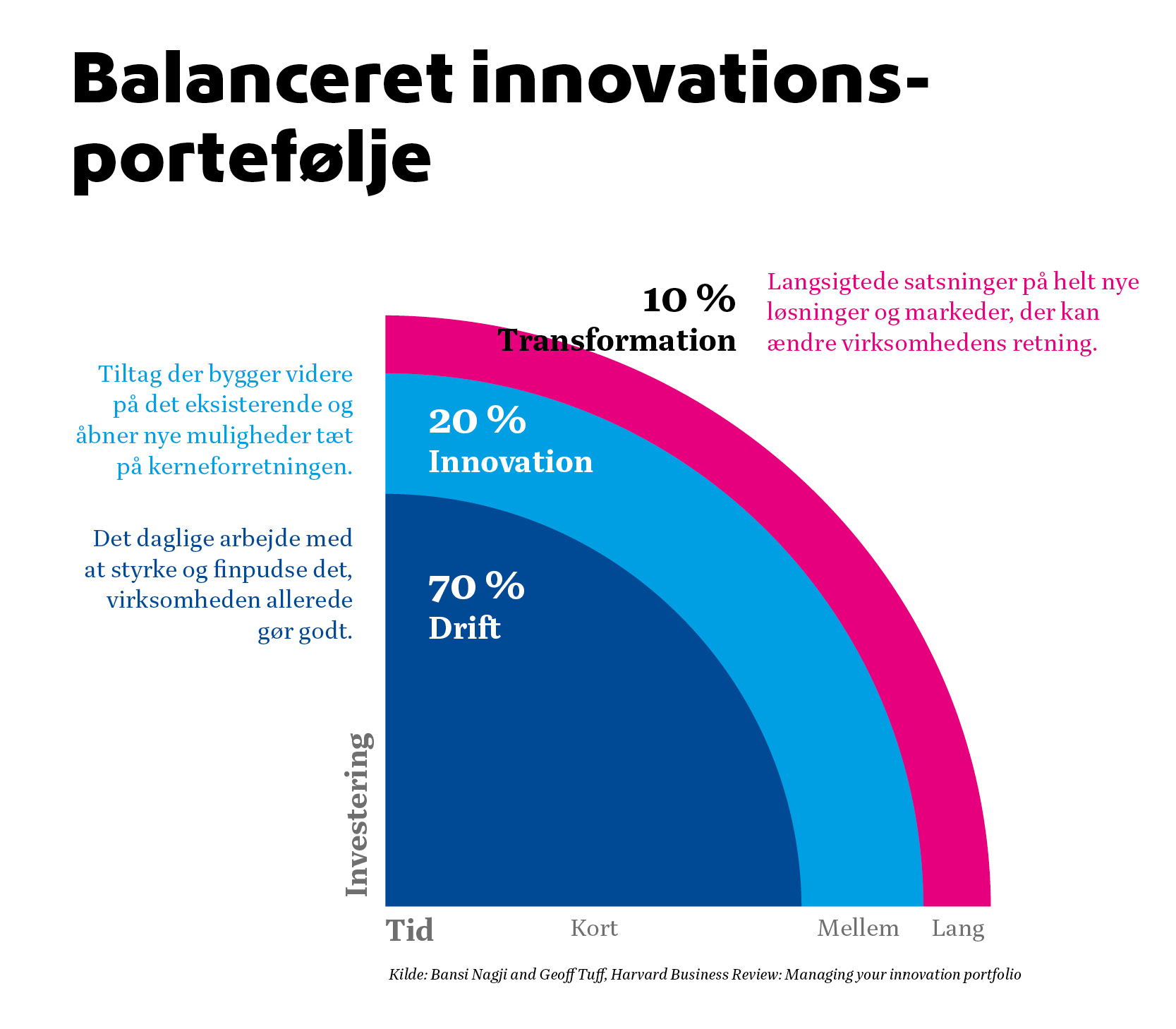 Svaret behøver ikke være en pæn fordeling. Man snakker ofte om en 70-20-10 fordeling mellem drift, innovation og transformation. Men hvis det hele ender i drift og små forbedringer, sniger en risiko sig ind. Man kan være effektiv og alligevel langsomt glide ud af relevans. Det er sådan, dygtige virksomheder vågner op og opdager, at verden er gået videre. De gjorde som sådan ikke noget forkert i går. De gjorde for lidt rigtigt i forhold til at tænke på dagen i morgen.