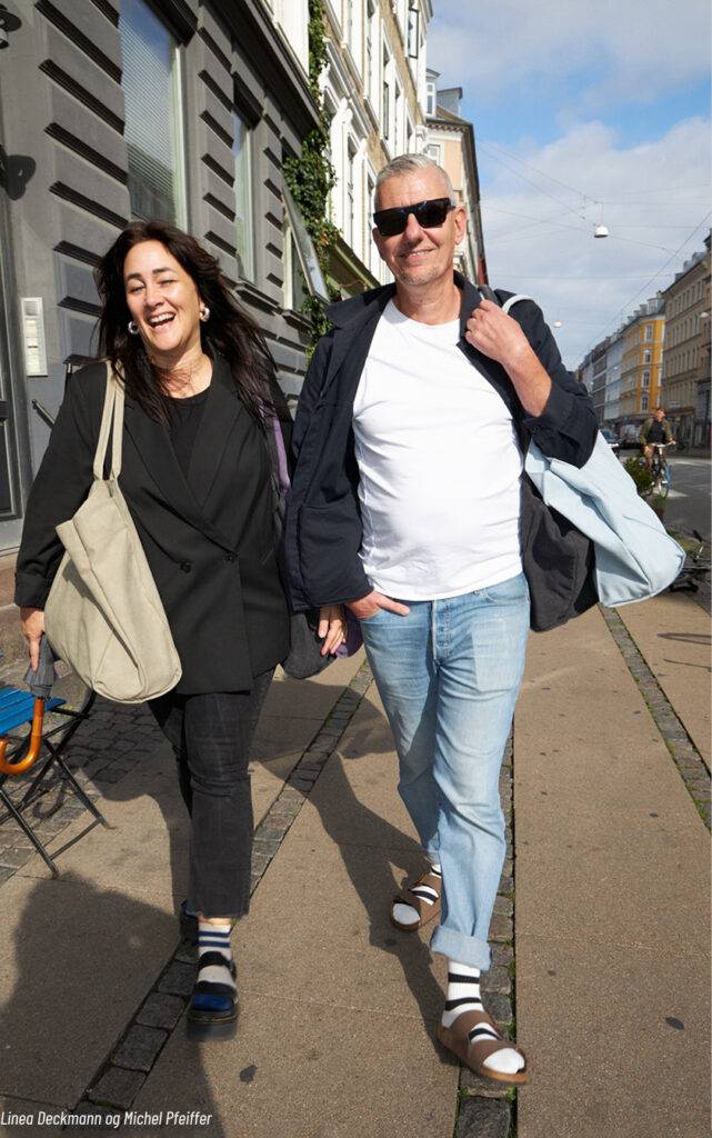 “We started at Nørreport Station and then moved on to Halmtorvet, Istedgade, and ended at Værnedamsvej. It turned into a whole day of shooting through Copenhagen, meeting locals and people from all over the world. You don’t have to look a certain way to wear our socks. All fashion is usually so styled, staged, and unattainable. We prefer to make it accessible and emphasize our message of creating lovely everyday socks for everyday people,” explains Linea Deckmann, one half of AYDO Studios, along with her partner Michel Pfeiffer.