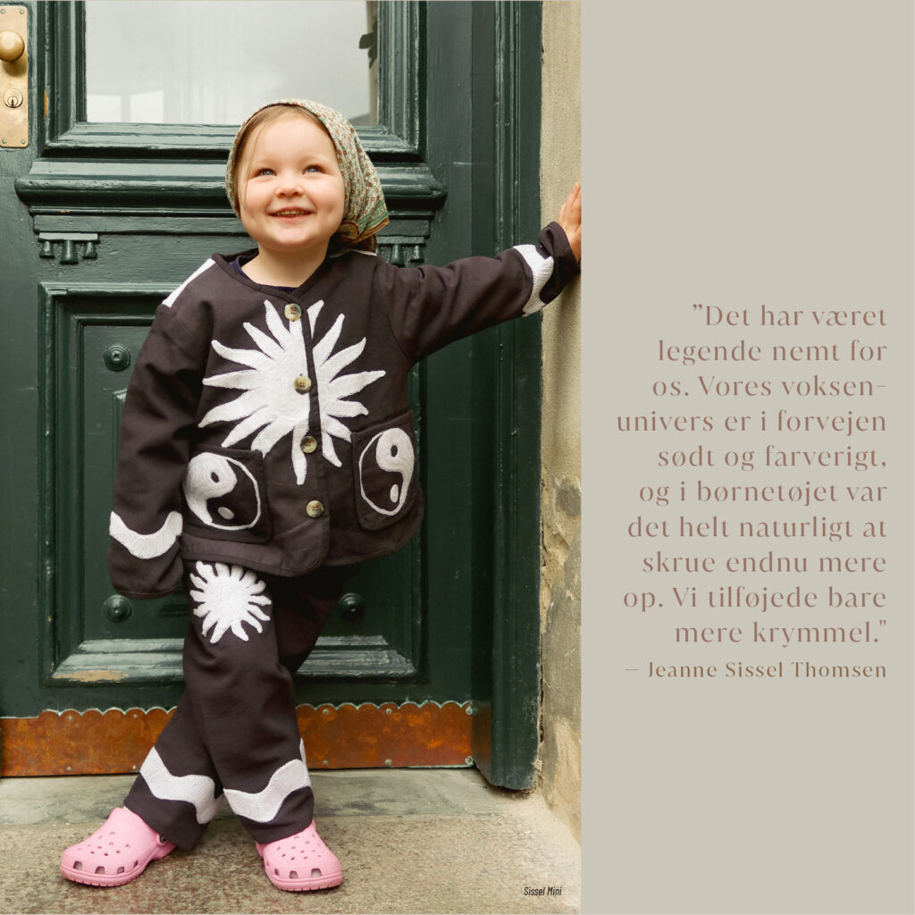 Resultatet er små jakker, veste, kjoler, nederdele og sæt, der føles unikke. Sissel Mini rimer på produkter med personlighed, hvor farver, håndværk og selve universet smelter sammen.
